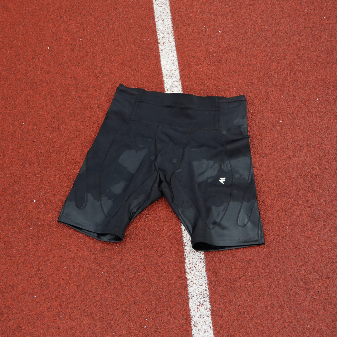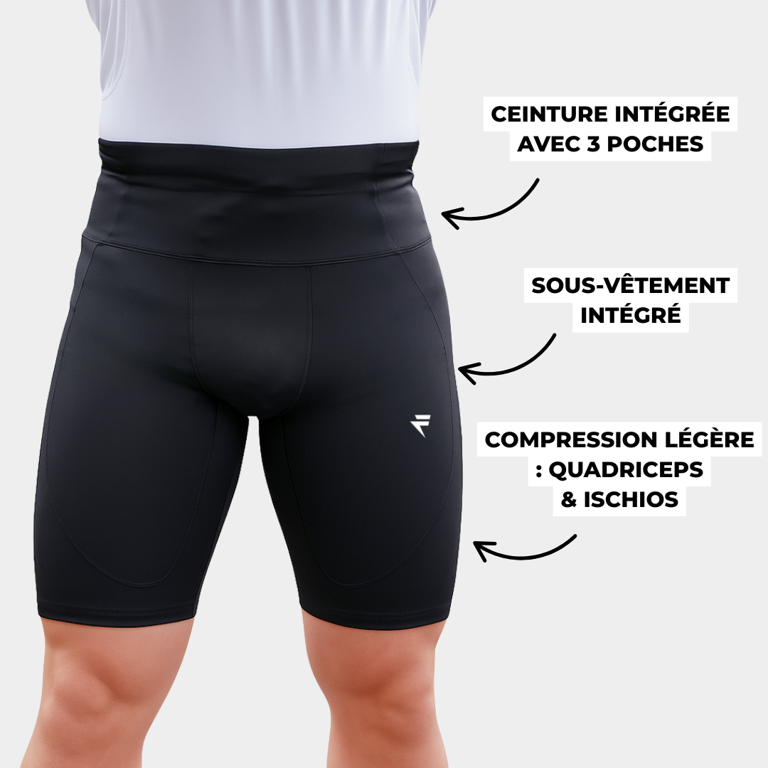 Un cuissard de compression pratique avec une ceinture intégrée, conçu pour rendre vos sorties courses plus confortables.