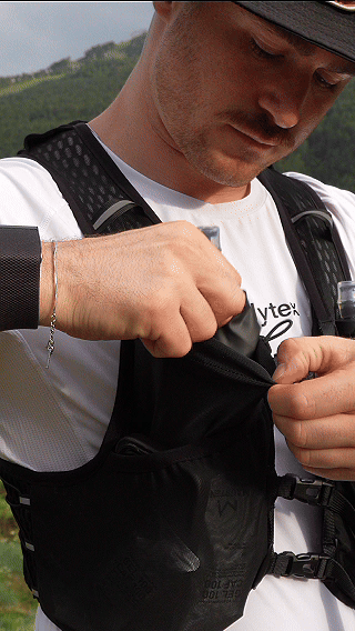 - À l’avant : une poche zippée, deux poches pour gels ou téléphone, deux emplacements pour flasks de 500 ml.